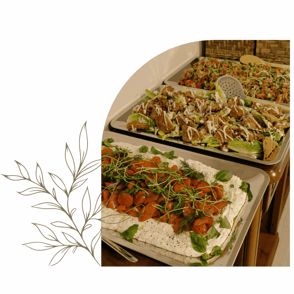 Zapewniamy wegetariańskie i wegańskie posiłki – śniadanie, obiad, kolację oraz deser. Do tego nieograniczony dostęp do kawy, herbaty i ziół.