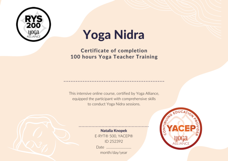 Na zakończenie otrzymasz dyplom YACEP® Yoga Alliance 100 h uprawniający Cię do nauczania Jogi Nidry na całym świecie.