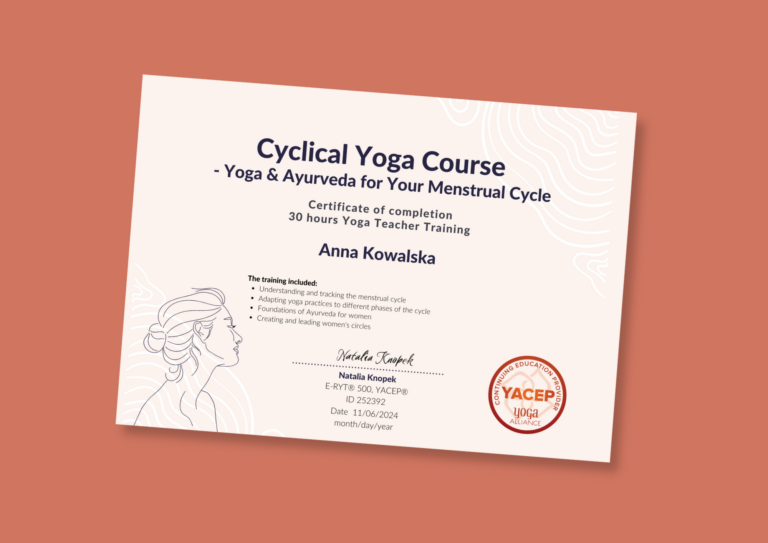 Po pierwsze – otrzymasz dyplom YACEP® Yoga Alliance 30 h potwierdzający Twoją wiedzę na temat kobiecej cykliczności, jogi i relaksacji dopasowanej do fazy cyklu.